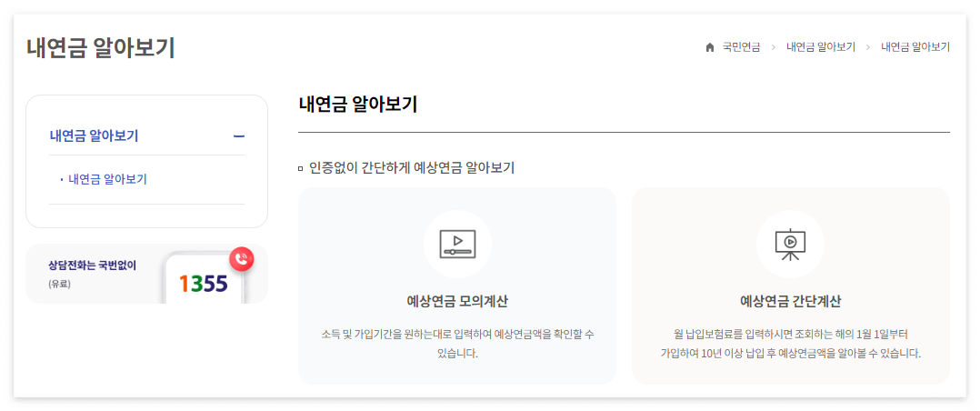 홈페이지에 로그인 후 ‘중앙노후준비센터’에서 ‘내연금 알아보기’를 클릭하여 예상연금액을 확인할 수 있습니다.