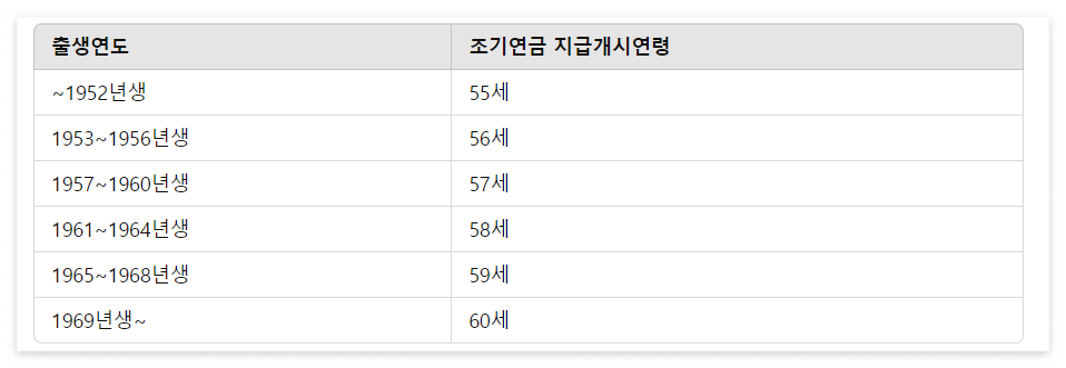 조기수령은 일반적인 수령시기보다 최대 5년 먼저 받을 수 있습니다. 출생연도별 조기수령 나이는 다음과 같습니다.