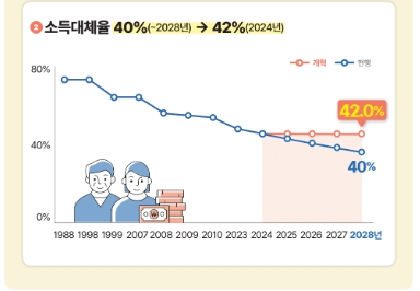 또한, 명목소득대체율을 현행 40%에서 42%로 상향 조정합니다. 소득대체율은 은퇴 후 받게 되는 연금이 은퇴 전 소득의 몇 퍼센트를 차지하는지를 나타내는 지표로, 이번 개혁을 통해 은퇴 후 소득 보장을 강화할 계획입니다.