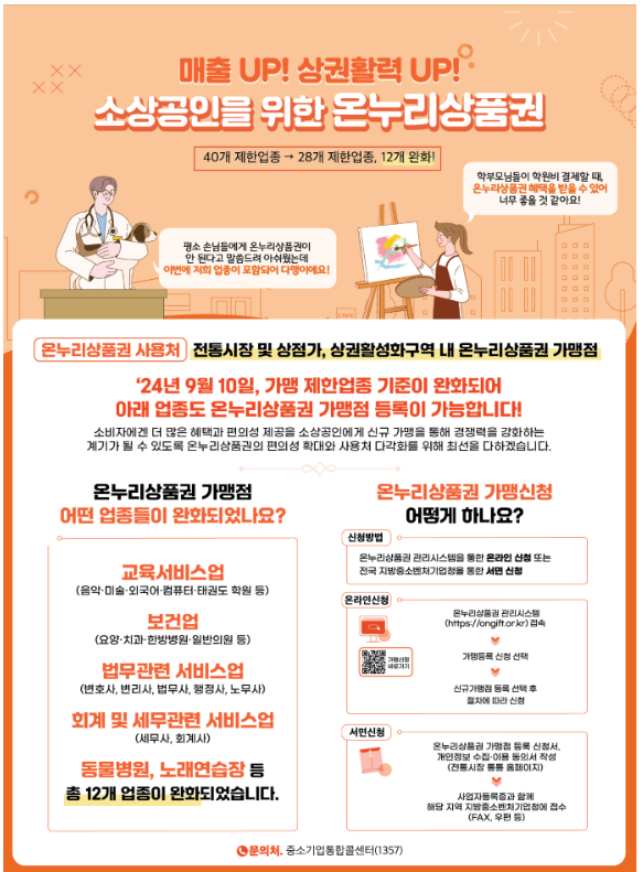 이제 전통시장 내 학원, 의원, 한의원, 동물병원 등에서 온누리상품권을 사용할 수 있게 됩니다. 이는 9월 3일 국무회의에서 통과된 ‘전통시장 및 상점가 육성을 위한 특별법 시행령’ 개정안에 따른 것으로, 그동안 온누리상품권 가맹 등록이 불가능했던 12개 업종이 새롭게 등록할 수 있게 되었습니다. 그동안 온누리상품권 사용이 제한되었던 학원, 병의원, 노래방 등의 업종에서 소비자들은 이제 온누리상품권으로 결제할 수 있습니다.